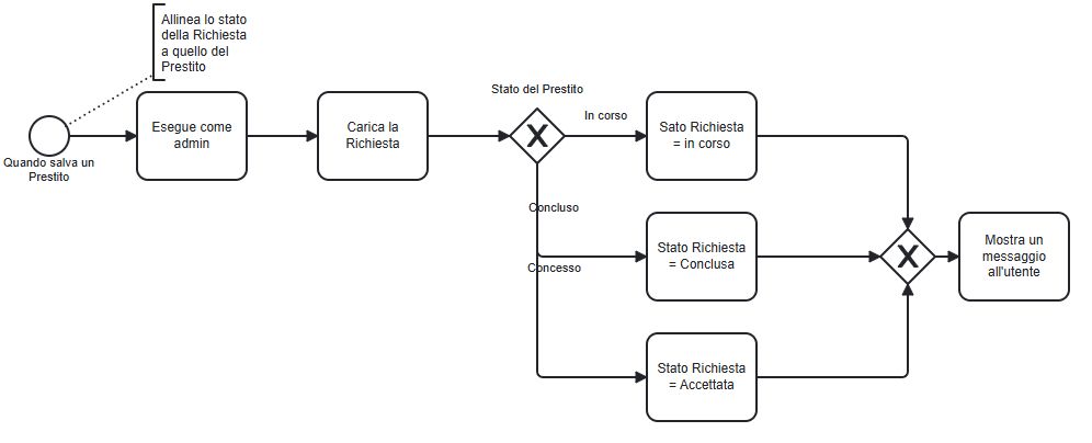 3avvisa l'Utente che è stato cambiato lo Stato della RichiestaAggiungi l'Azione Mostra un messaggio all'utente. In Messaggio digita "Lo Stato della Richiesta [richiesta] è stato allineato a quello del Prestito"