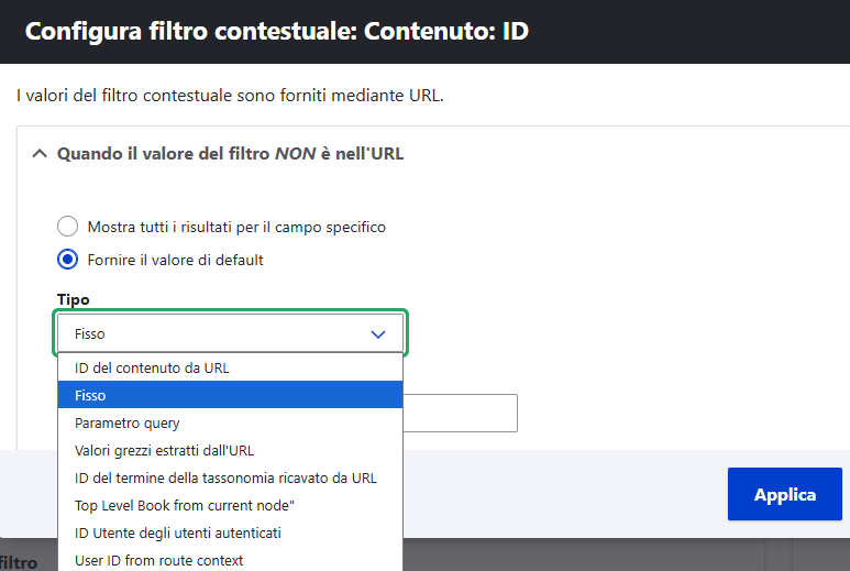 Se scegli Mostra tutti i risultati per il campo specifico il Filtro viene ignorato. Se scegli Fornire il valore di default devi specificare dove prendere il valore mancante; tra le opzioni più comunemente usate: ID del contenuto dell'URL (utile per i Blocchi, lo vedremo a suo tempo), Fisso (un valore fisso), Parametro query (es. se costruiamo il link come /tuoi-attrezzi?categoria=12 e indichiamo qui "categoria" come parametro, il valore viene preso dal nome del parametro e non dalla sua posizione), ID Utente degli utenti autenticati (ID dell'Utente corrente).