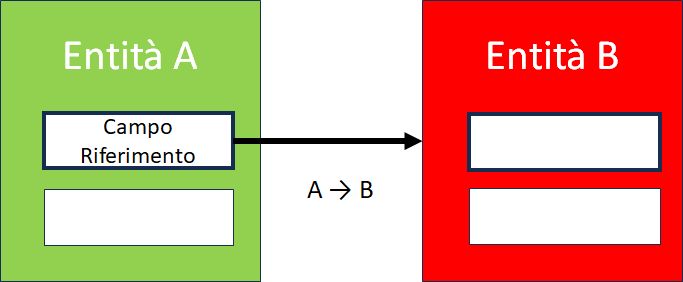 Le relazioni tra Entità sono basate sui Campi Riferimento. Una Entità A è in relazione con una Entità B se l'Entità A ha un Campo Riferimento che rimanda all'Entità B. Rappresentiamo sinteticamente questa relazione come A → B
