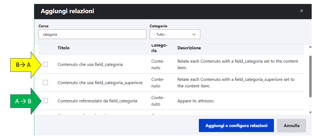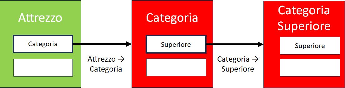 Ad esempio, per la relazione Attrezzo → Categoria, se selezioni la riga evidenziata in verde la usi in senso diretto (dall'Attrezzo risali alla Categoria), mentre se selezioni la riga evidenziata in giallo la usi in senso inverso (dalla Categoria risali all'Attrezzo).