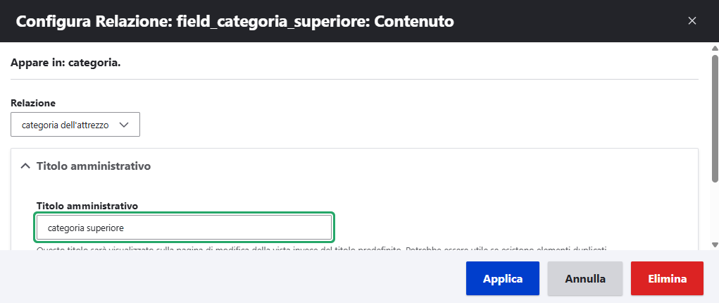 - seleziona il Campo "Categoria Superiore" della Categoria, elencato come Contenuto referenziato da field_categoria_superiore" che appare in Categoria