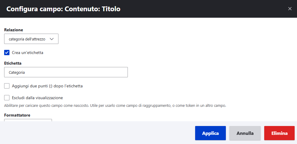 Dichiarata una relazione A→B nella sezione Relazioni, per usare nelle altre sezioni della Vista un Campo dell'Entità B basta selezionare quella relazione nella finestra di configurazione del Campo. Ecco ad esempio come aggiungere alla Vista il Campo "titolo" della Categoria cui appartiene un Attrezzo: