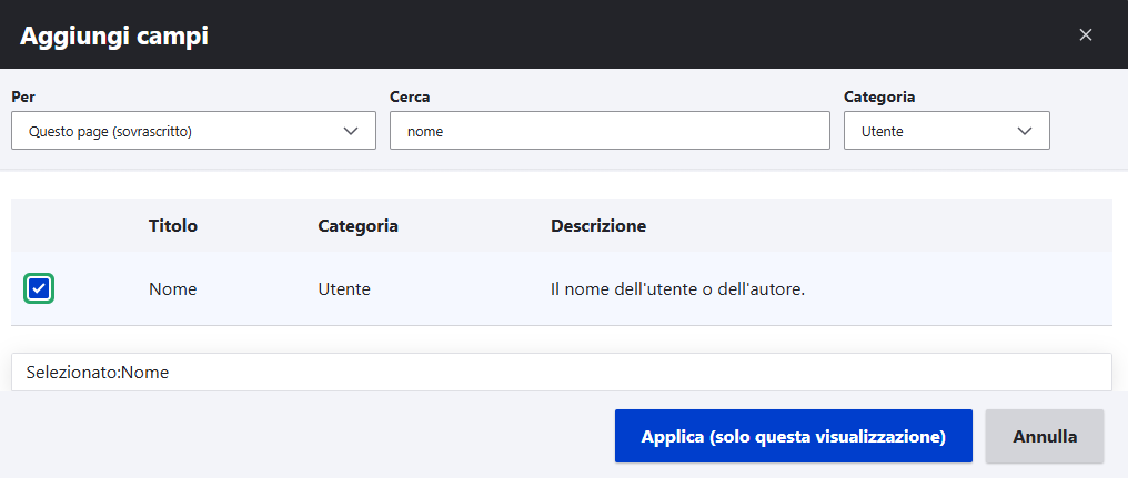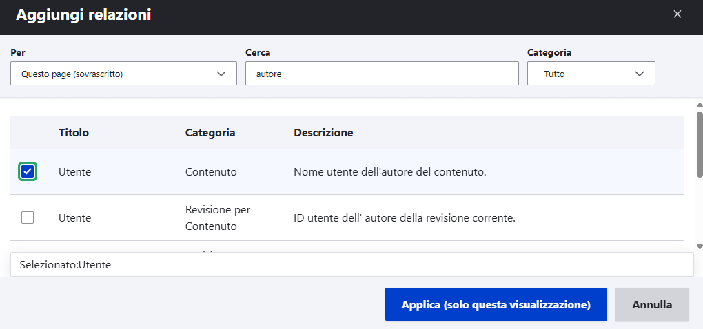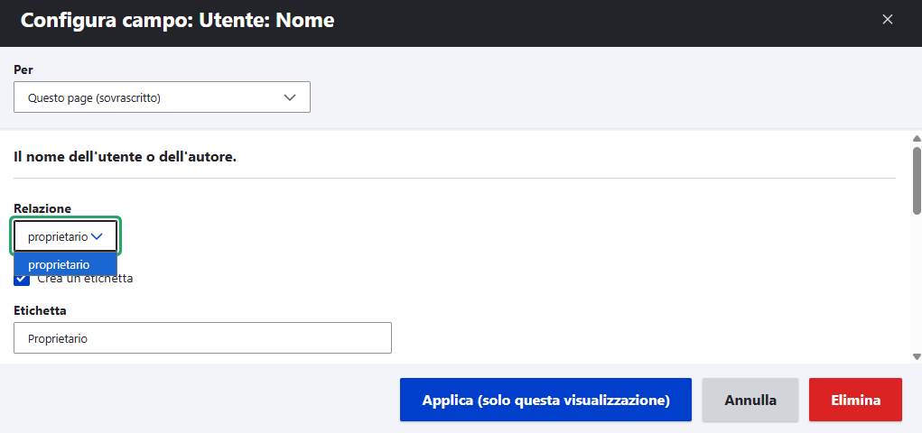 - seleziona Nome - Utente - Il nome dell'utente o dell'autore e, come Relazione, seleziona "proprietario"; come Etichetta digita "Proprietario"