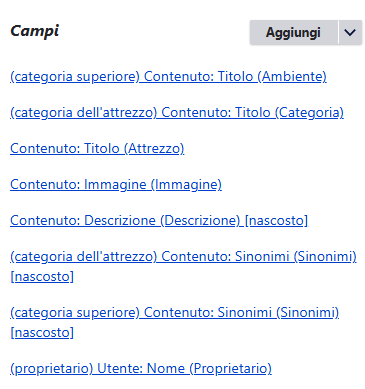 In tutte le altre sezioni della Vista, per accedere ad un Campo di una Entità messa a disposizione da una relazione, basta selezionarla come Relazione nella configurazione del Campo. In questo modo, nella sezione Campi possiamo aggiungere alla Vista "Magazzino" il Campo "Sinonimi" della Categoria ed i Campi "Titolo" e "Sinonimi" della Categoria Superiore; nascondiamo i Campi "Sinonimi" (li useremo per la ricerca ma confonderebbero l'Utente se mostrati) e riordiniamo i Campi, per mostrare da sinistra verso destra prima la Categoria superiore (di cui possiamo cambiare etichetta in "Ambiente"), poi la Categoria ed infine l'Attrezzo vero e proprio: