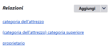 Nella app di esempio, una Categoria (es. "Cesoia") può appartenere ad una Categoria superiore (es. "Giardinaggio"). La relazione Categoria → Categoria Superiore è basata sul Campo "Categoria Superiore" della Categoria. In una Vista basata sugli Attrezzi, con la catena di relazioni Attrezzo → Categoria e Categoria → Categoria Superiore possiamo associare all'Attrezzo anche la Categoria superiore: