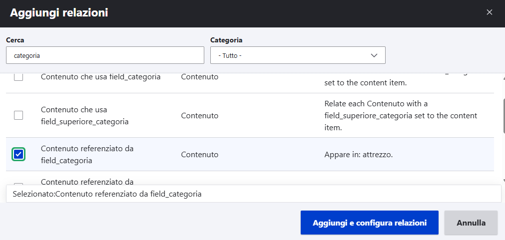 - come spiegato, seleziona "Categoria" dell'Attrezzo, che è elencato come contenuto referenziato da seguito dal nome interno del Campo ("field_categoria") e che appare in: "attrezzo"