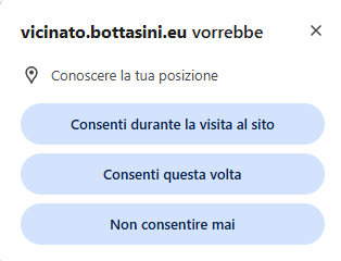 Per definire la posizione geografica di una Sede, basta modificarla. Per il Campo "Coordinate" ti viene mostrata una mappa su cui cliccare per posizionare l'Entità. Se hai attivato l'opzione Use HTML5 Geolocation to set Default Values, viene mostrata una finestra che chiede l'autorizzazione a utilizzare la tua posizione attuale per posizionare il puntatore dentro la mappa: