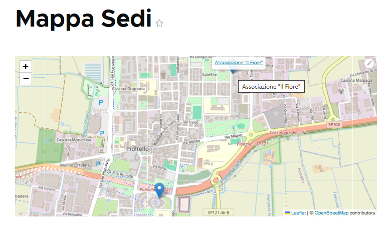 | mostra le Sedi sulla mappa | In Formato seleziona Leaflet. In Impostazioni come Sorgente dati seleziona il Campo "Coordinate", come Tooltip Source seleziona "Titolo". Ci sono moltissime altre configurazioni possibili, ma per i nostri scopi didattici non servono, ad esempio c'è la possibilità di usare icone differenti per le Entità in base al valore di un loro Campo. |